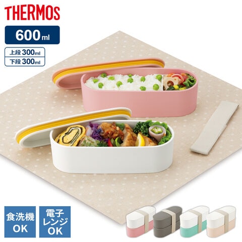 サーモス 2段弁当箱 フレッシュランチボックス 600ml DJT-601W | 弁当箱 THERMOS 食洗器対応 パッキンつき 電子レンジOK 2段式 角がない 洗いやすい スリムサイズ 仕切り付き バンド付きシンプル かわいい