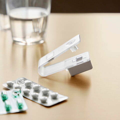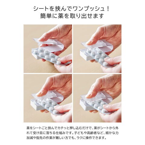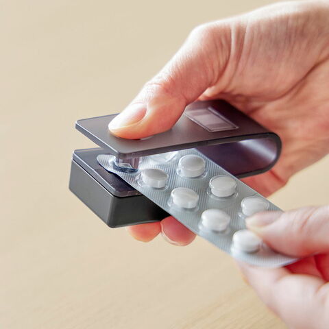 錠剤やカプセルをシートごと挟んでワンプッシュするだけで、簡単に薬を取り出せる錠剤オープナー。