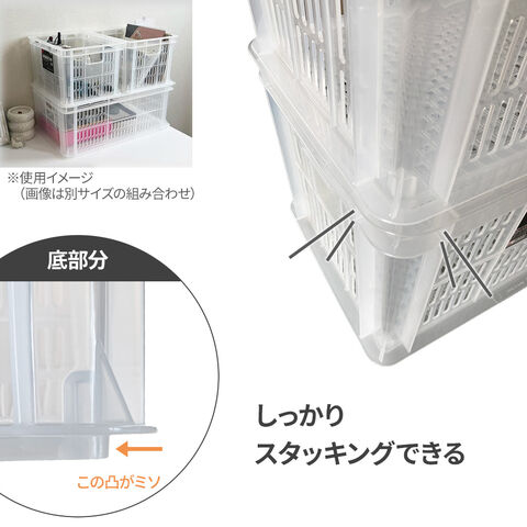 スタッキング可能底の凸部分がしっかりと開口部の枠にはまり込むので、同サイズの積み重ねが可能。