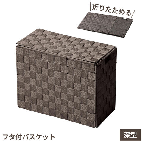 フタ付き折りたたみ式バスケット 深型 ダークブラウン | 収納ボックス 編みかご 蓋付き 浅型 深型 折りたたみ おしゃれ ナチュラル 手編み カゴ ケース 目隠し収納 掃除道具 スリッパ 小物入れ ランドリー トイレ リビング 玄関