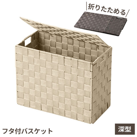 フタ付き折りたたみ式バスケット 深型 ベージュ | 収納ボックス 編みかご 蓋付き 浅型 深型 折りたたみ おしゃれ ナチュラル 手編み カゴ ケース 目隠し収納 掃除道具 スリッパ 小物入れ ランドリー トイレ リビング 玄関