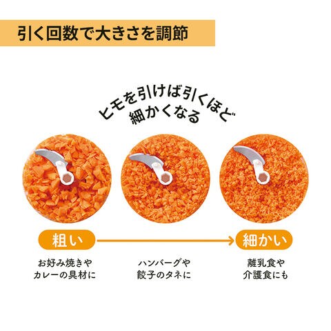 引く回数で大きさを調節紐を引く回数によって粗い→細かいを調節できます。