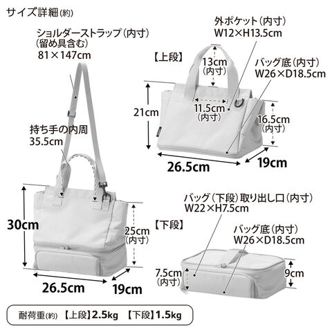 スペック商品サイズ(約):連結時/幅26.5×奥行19×高さ30cm(持ち手・ショルダーストラップ含まず) 上段/幅26.5×奥行19×高さ21cm 下段/幅26.5×奥行19×高さ9cm