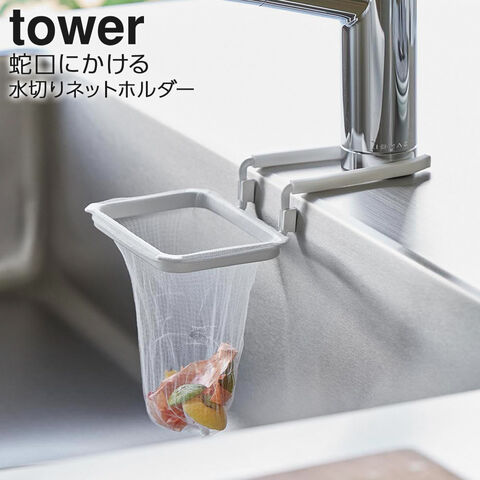 山崎実業 tower タワー 蛇口にかける水切りネットホルダー ホワイト 10515 / ブラック 10516 | 三角コーナー 代用 キッチン シンク 浮かせる 省スペース 台所 流し台 コンパクト 簡単設置 便利グッズ 生ゴミ 水切りネット キズ防止 滑り止め ゴミ捨て