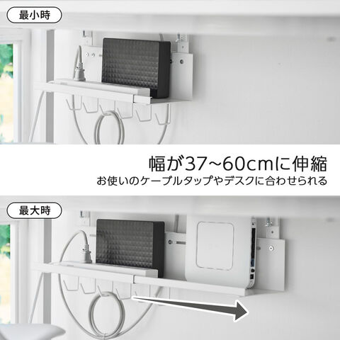 トレーは伸縮可能幅37~60cmに伸縮するので、お使いのケーブルタップやデスクのサイズに合わせてお使いいただけます。