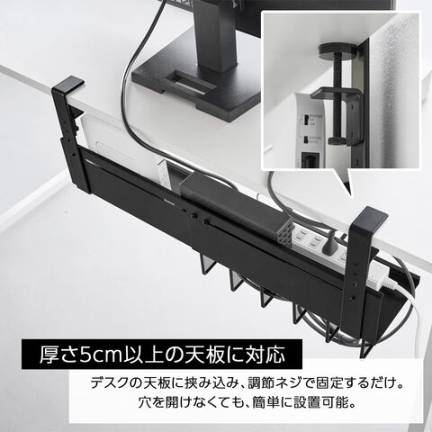 デスクの天板を挟み込むだけで簡単に設置できる、伸縮可能なデスク下収納トレー。