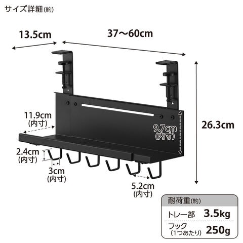 内寸サイズ(約):トレー部/幅37~60×奥行11.9×高さ9.7cm フック部/奥行3×高さ2.4cm