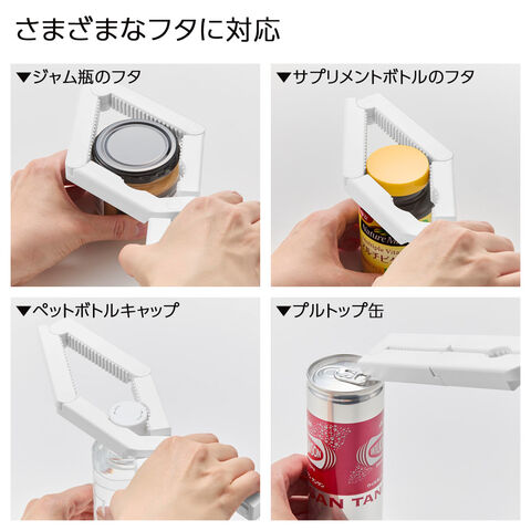 さまざまなフタに対応挟む位置を変えることで、ジャム瓶やペットボトル、サプリメントのボトルなど幅広い蓋にフィット。