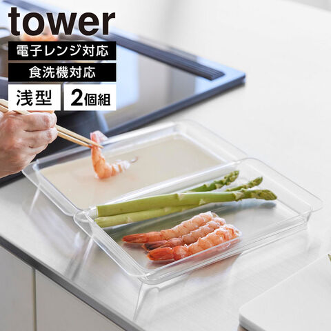 山崎実業 tower タワー 電子レンジ対応 連結できる洗いやすい下ごしらえ調理トレー 浅型 2個組 クリア | バット 電子レンジ対応 食洗機対応 冷蔵 冷凍 角バット プラスチック トンカツ とんかつ 唐揚げ 天ぷら 調理バット 調理トレイ おしゃれ 透明
