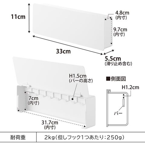 耐荷重:2kg ※但しフック1つあたり 250g(静止荷重)