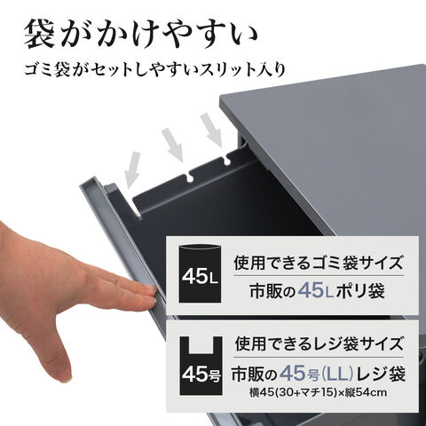 使用できるポリ袋サイズ上・下段とも/市販45L用ポリ袋(幅650×高さ800mm)・レジ袋45号(LLサイズ)※約横45cm(仕上幅30cm+マチ15cm)×縦54cm