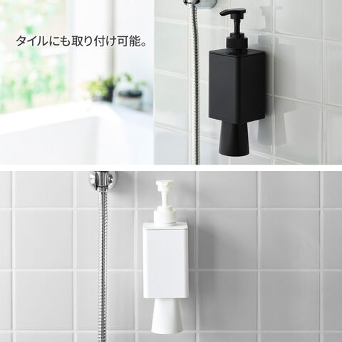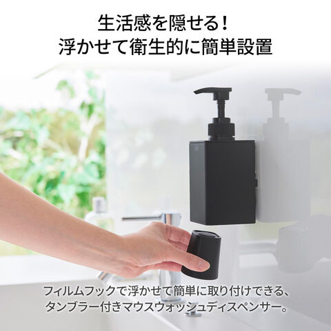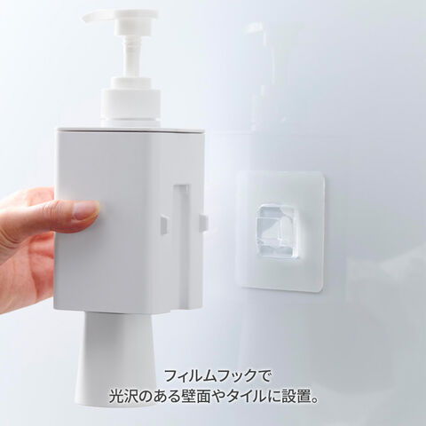 浮かせて収納するディスペンサーマウスウォッシュディスペンサーは、フィルムフックで光沢のある壁面やタイルに設置でき、生活感を感じさせず、衛生的に使えます。