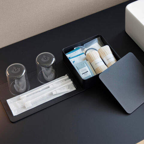 必要なアイテムをすっきり収納できる、スタイリッシュなボックス付きスチール製トレー。