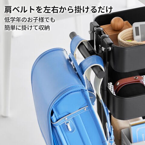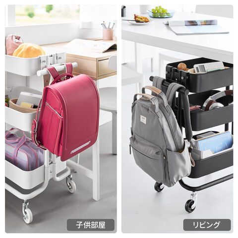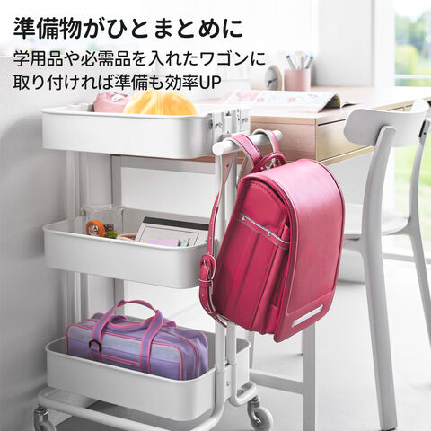 お手持ちのスチールワゴンの横に設置することで、勉強道具や必需品と一緒に、ランドセルやリュックをひとまとめにできます。