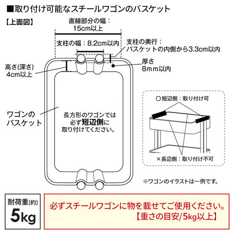 取り付け可能なスチールワゴンのバスケット【バスケット(短辺側)】幅(直線部分)15cm以上、厚さ8mm以内、高さ(深さ)4cm以上