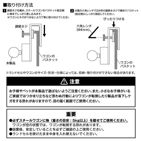 長方形のワゴンでは、必ずバスケットの短辺側に取り付けてください。