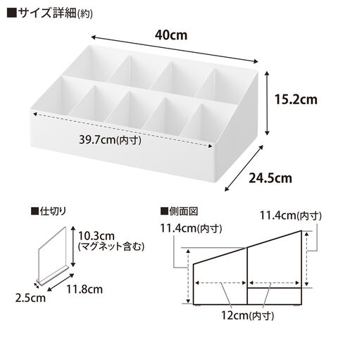 内寸サイズ(約):収納部1つあたり/幅39.7×奥行12×高さ11.4cm 仕切り1つあたり/幅2.5×奥行11.8×高さ10.3cm
