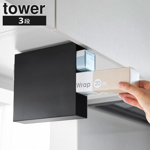 山崎実業 tower タワー 戸棚下 ラップホルダー 3段 ホワイト 10505 / ブラック 10506 | ラップ 収納 吊り下げ 吊戸棚 キッチン 戸棚下収納 3連 アルミホイル クッキングシート 賃貸 棚板 1.4~2センチ 白 黒