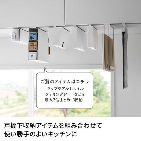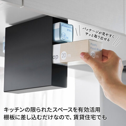 ラップを浮かせて収納置き場所に困るラップ類を、戸棚下のスペースを有効活用して収納できます。