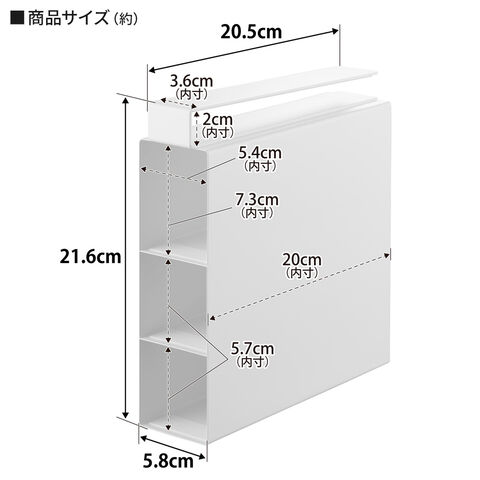内寸サイズ(約):収納部1段あたり/幅5.4×奥行20×高さ7.3(上段)、高さ5.7(中・下段)cm
