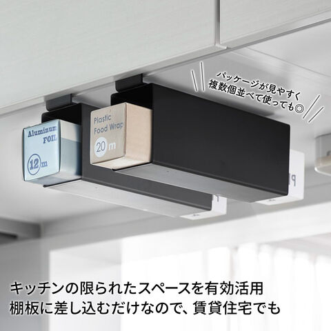 ラップを浮かせて収納置き場所に困るラップ類を、戸棚下のスペースを有効活用して収納できます。