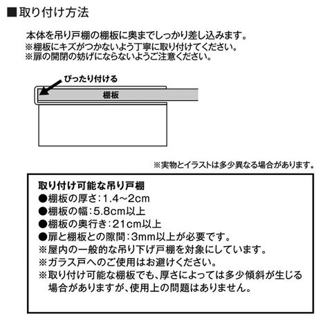 簡単設置吊戸棚の棚板に差し込むだけで設置完了。