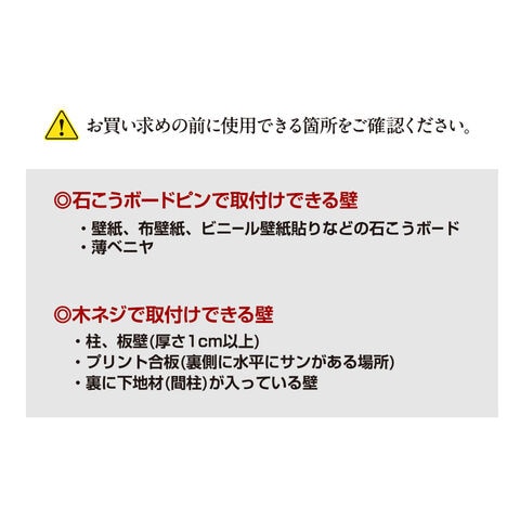 木ネジ使用時:柱・板壁(厚さ1cm以上)、プリント合板(裏側に水平にサンがある場所)、裏に下地材(間柱)が入っている壁