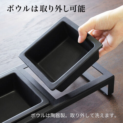 スチール製のフレームに陶器の餌皿をセットした、おしゃれなペットのエサ入れ。