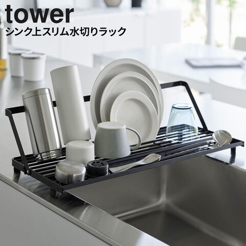山崎実業 tower タワー シンク上スリム水切りラック シリコーントレー付き ホワイト 10581/ブラック 10582 | 水切りバスケット 水切りカゴ ラック シンク上 省スペース スリム コンパクト 浅型 食器 まな板 カトラリー 水筒 ボトル 乾燥 乾きやすい シリコン シリコーン シンプ
