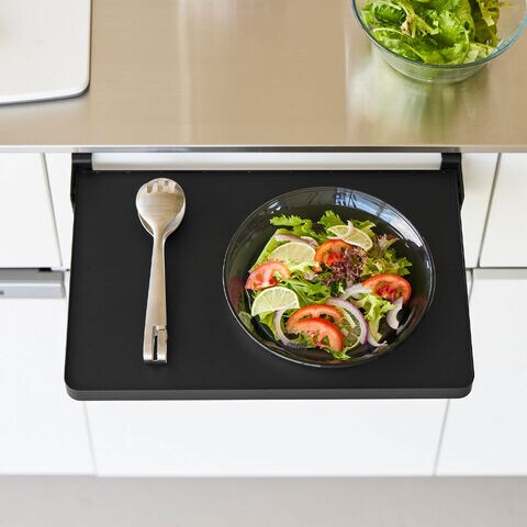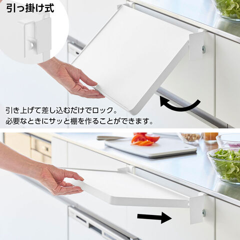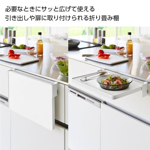 必要なときにサッと広げて使える、引き出しや扉に取り付けられる折り畳み棚です。