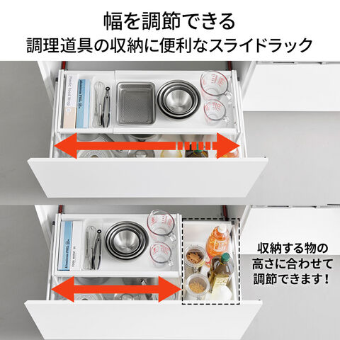 シンク下の引き出し中スペースを有効活用できる、伸縮スライドラック。