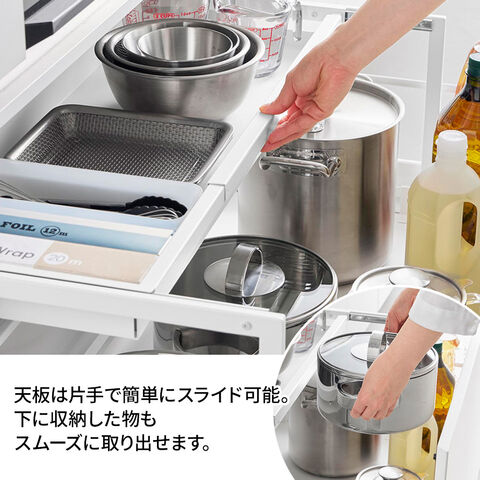 天板は片手で簡単にスライドでき、奥へ動かすと下に収納した物もスムーズに取り出せます。