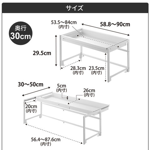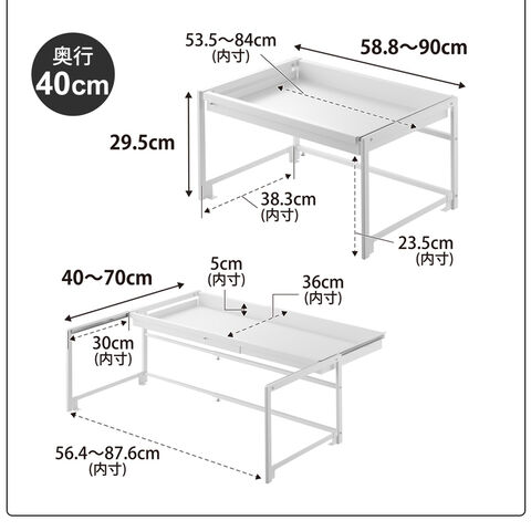 内寸サイズ(約):天板/幅53.5~84×奥行36×高さ5cm 天板スライド時の開口部/幅30cm 天板下/幅56.4~87.6×奥行38.3×高さ23.5cm