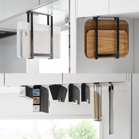 置き場所に困るまな板やトレーを浮かせて収納でき、キッチンをすっきり整理できます。