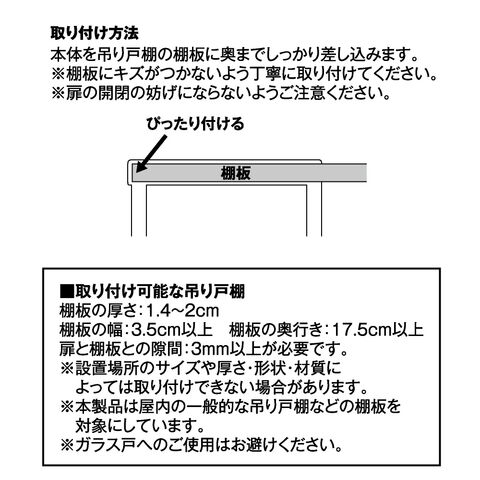 取り付け可能な吊り戸棚棚板の厚さ:1.4~2cm 棚板の幅:3.5cm以上 棚板の奥行き:17.5cm以上 扉と棚板との隙間:3mm以上が必要です。