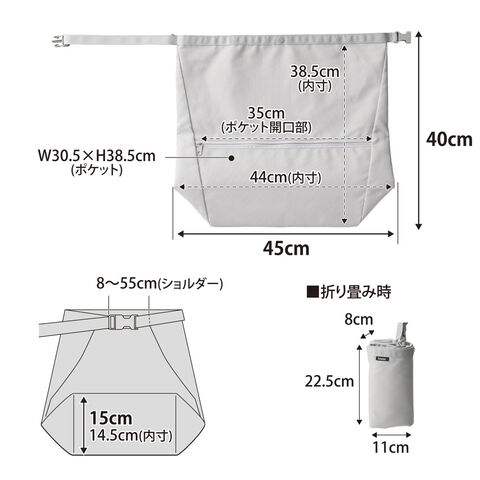 スペック商品サイズ(約):広げた時/幅45×奥行15×高さ40cm 折り畳み時/幅11×奥行8×高さ22.5cm ショルダーストラップの長さ/8~55cm
