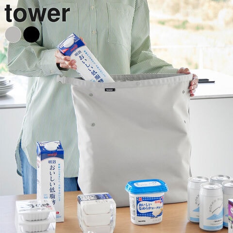 山崎実業 tower タワー 量によって調節できる保冷&保温ショッピングエコバッグ ライトグレー 10656/ブラック 10657 | 保冷バッグ エコバッグ 折りたたみ 洗える ショルダー サイズ調整 ポケット付き 保冷 保温 買い物バッグ レジバッグ