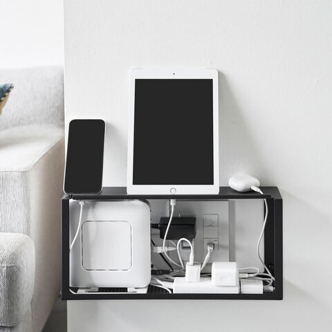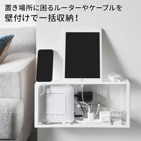 置き場所に困るルーターやケーブルを収納できる壁付けラック。