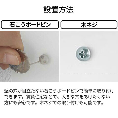 石膏ボードピンで簡単設置壁の穴が目立ちにくい、石こうボードピンを使って壁面に取り付けて使います。※木ネジでも取り付け可能。
