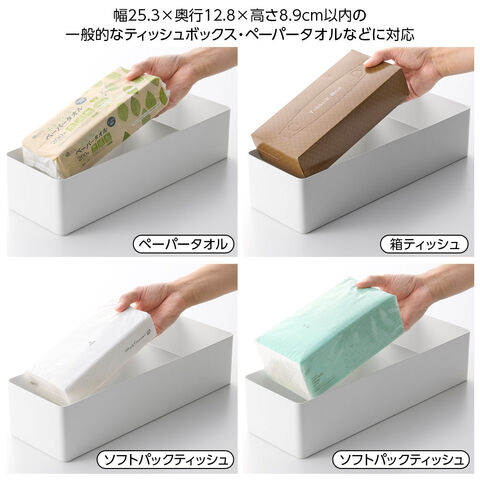 対応サイズ(約):幅25.3×奥行12.8×高さ8.9cm以内の一般的なティッシュボックス・ペーパータオルなど ※サイズや形状によっては収納できない場合があります。