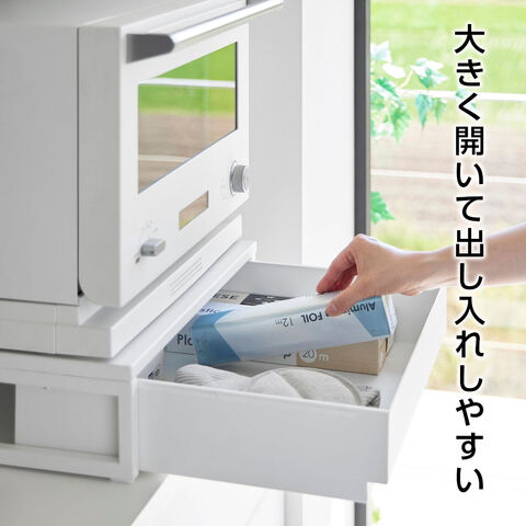 引き出し付き高さのある引き出し付きで、ラップなどの電子レンジ周りのキッチン小物をたっぷり収納。