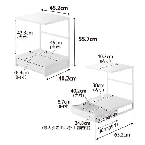 内寸サイズ(約):上棚/幅45.2×奥行40.2cm 置き台/幅45×奥行38.4×高さ42.3cm 引き出し/幅40.2×奥行38×高さ8.7cm(開口部最大幅24.8cm)