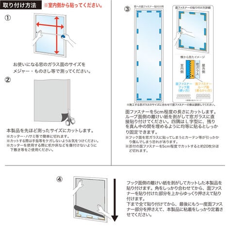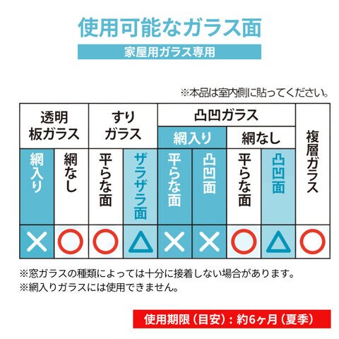 ご注意網入りガラス、線なしの凹凸ガラス、複層ガラスには使用できません。木製フレームや窓のアルミ部分ではなく、必ず屋内のガラス面に貼り付けてください。