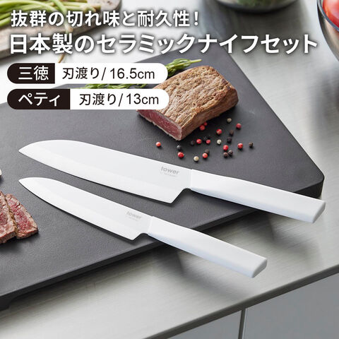 幅広く使える三徳包丁(刃渡り/16.5cm)と小回りが利くペティナイフ(刃渡り/13cm)の日本製セラミックナイフ2点セット。