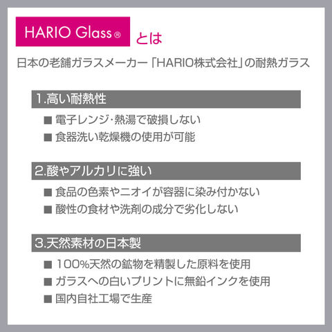 耐熱ガラス「HARIO Glass」製本体には、高い耐熱性と耐薬品性を誇り、医学・理化学の分野でも安全性が評価されている耐熱ガラス「HARIO Glass」を使用。