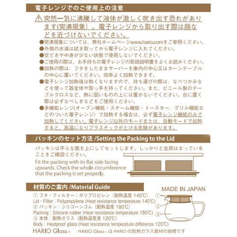 材質:本体/耐熱ガラス フィルター付きフタ/ポリプロピレン パッキン/シリコーンゴム