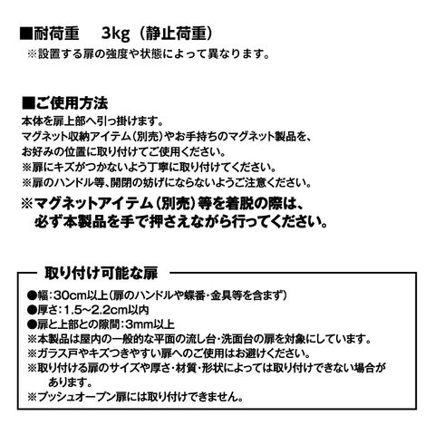 設置できる扉のサイズ幅30cm以上・厚さ1.5から2.2cmの扉に対応。