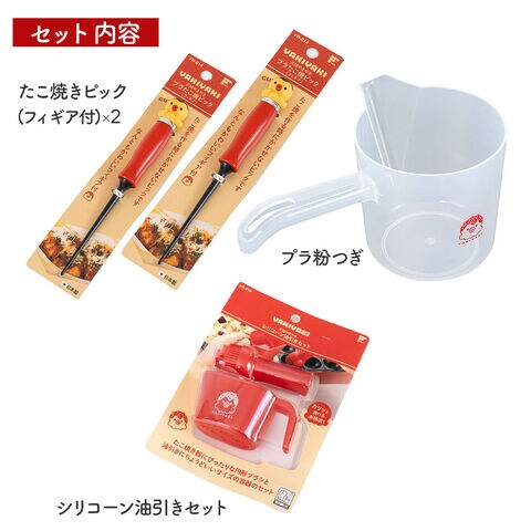 耐熱樹脂製のたこ焼きピック×2本・プラスチック製粉つぎ・シリコーンブラシの油引きセットの3種類。