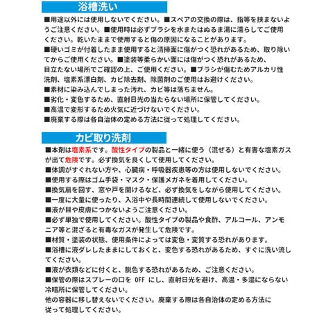 材質:【共通】ゴム磁石 【浴槽洗い】ヘッド・ブラシ/ポリプロピレン 柄/アルミ 【床洗い】スポンジ/ポリウレタン ブラシ/ナイロン・ポリエステル 【スミズミブラシ】ブラシ/PET・ナイロン 【カビ取り洗剤】次亜塩素酸塩・水酸化ナトリウム(8%)・界面活性剤(アルキルスルホン酸ナトリウム)・増粘剤