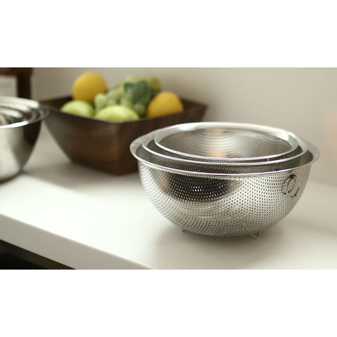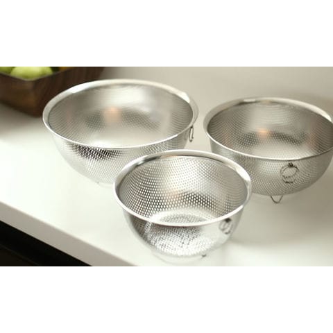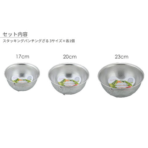 重ねて収納できるパンチングタイプのざる3個セット。サイズは、17cm/20cm/23cm。